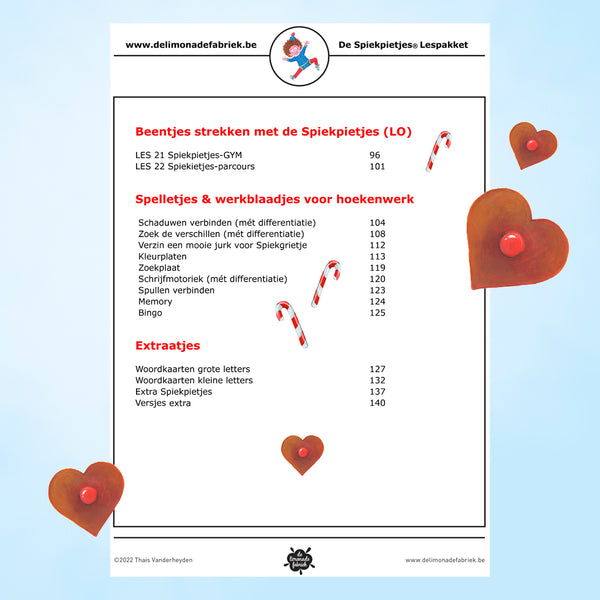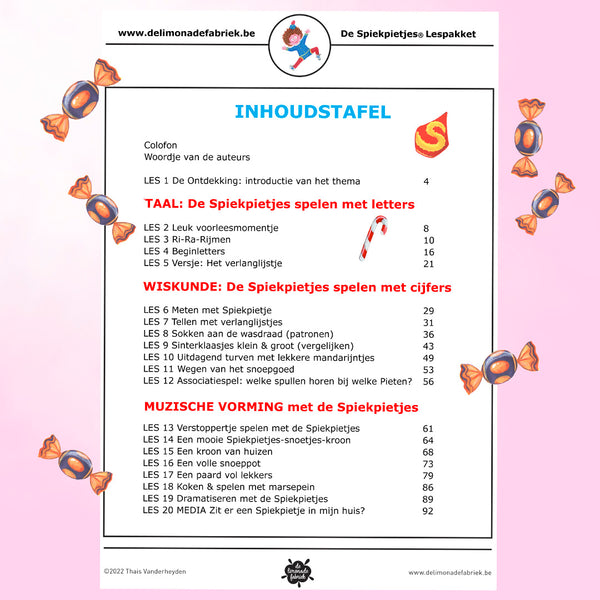 De Spiekpietjes vieren in 2022 hun 10de verjaardag en dat verdient een feestje! Niet alleen thuis maar ook in de klas! Daarom sloegen Spiekpietjesauteur Thaïs Vanderheyden en Super-juf Stefanie Lindner dit jaar de handen in mekaar. Die samenwerking resulteerde in 140 bladzijden 'Spelend Leren met de Spiekpietjes!' Het pakket focust zich op kinderen uit het 3e kleuterklas maar kan zeker ook gebruikt worden in het eerste trimester van het eerste leerjaar. Boordevol illustraties, uitvoerig uitgeschreven lessen met het nodige lesmateriaal erbij, en alle tips en inspiratie voor een creatief leuk klasthema. (Taal, wiskunde, muzische vorming, media, lichamelijke opvoeding, en een creatief pakket werkblaadjes en extra's voor hoekenwerk)