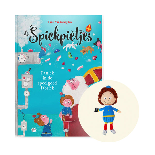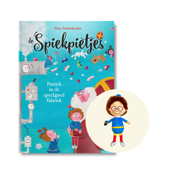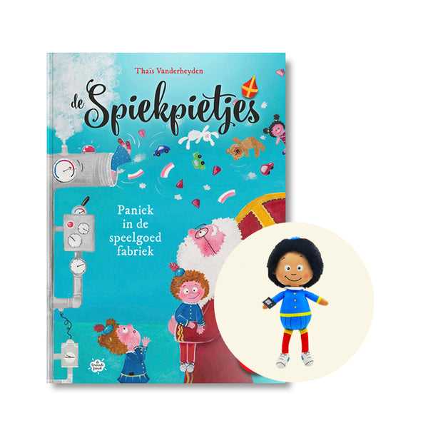 Dit voordeelpakket bevat een Spiekpietpopje naar keuze . (Er zijn 10 versies) en een prachtig prentenboek over 'Paniek in de Speelgoedfabriek'. Waarover dat gaat? Wel...